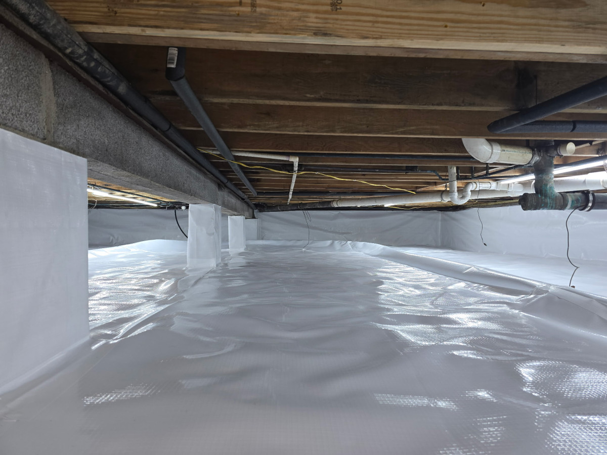 First, a heavy-duty polyethylene barrier is installed to cover the floor and walls of your crawl space. This barrier, or vapor barrier, is designed to keep out moisture that can lead to mold growth and structural damage.