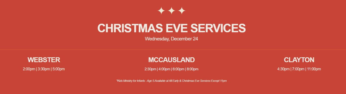 The Gathering will host Christmas Eve services on Wednesday, December 24, at all three locations. Early services will also be offered at the McCausland site on December 18, 22, and 23 at 7:00 PM.