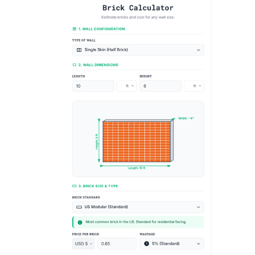 The last step is Brick Size & Type, where you can be very precise. You pick your Brick Standard—for instance, “US Modular”—and the standard measurements (usually 7 5/8″ x 2 1/4″ x 3 5/8”) get automatically applied to your selection. Moreover, a small info box confirms that this is the standard for the residential-facing side, which adds a bit more confidence to your decision. Most importantly, this section handles your budget. Entering the price per brick (e.g., $0.65) and selecting a wastage rate (typically set at 5%) are among the steps the calculator performs. The calculator doesn’t just count bricks; it estimates your financial outlay based on unavoidable on-site breakage.