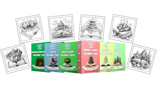 Inside the collection, users will find over 700 detailed coloring pages and 700 matching cover artworks, covering categories such as Ancient Temples, Cactus Gardens, Magical Mini Forests, and Crystals. Files are delivered in JPG, PNG, and PDF formats, ready for immediate upload to Amazon KDP, Etsy, or similar platforms.